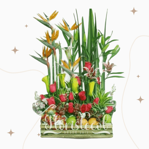 Arreglo Floral con Rosas rojas, orquideas,lirios y frutas
