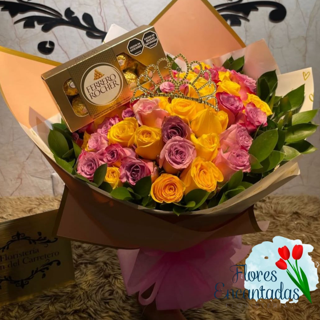 Arreglo Floral con Rosas, Amarillas y Rosadas Con Ferrero